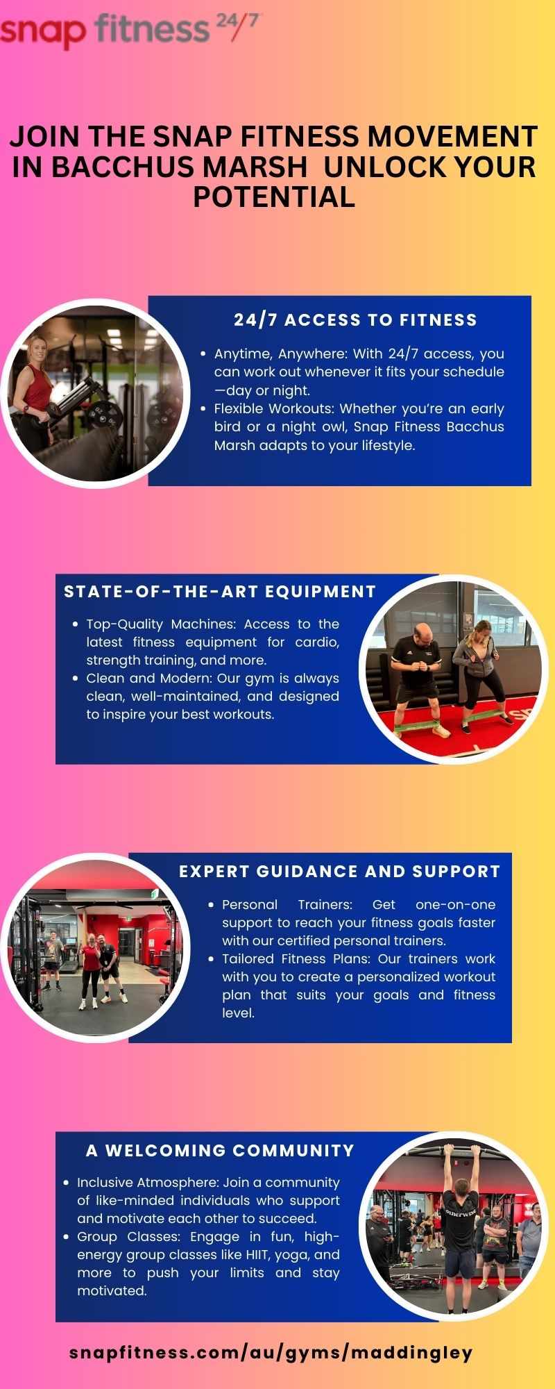 Ready to take your fitness to the next level? Snap Fitness Bacchus Marsh offers convenient 24/7 access, top-tier equipment, and expert trainers to guide you every step of the way. Whether you're looking to get stronger, fitter, or simply feel better, we’ve got everything you need to reach your goals. Join our community today and unlock the best version of yourself. Visit Us:- https://www.snapfitness.com/au/gyms/maddingley